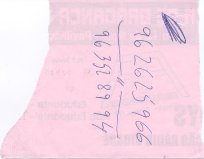 Numa das muitas idas a Bragança, este bilhete rasgado sem indicação da data e dos intervenientes. Na parte de trás descubro agora uns numeros de telefone escritos; tentei ligar mas não deram sinal de chamada.